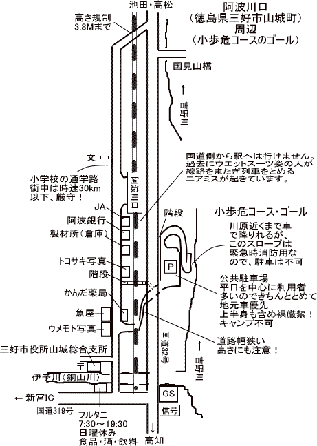 国道からJR阿波川口駅へ向かう旧道に入り、川口の商店街の、かんだ薬局(下流側)の横から入れます。
