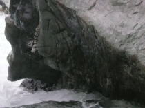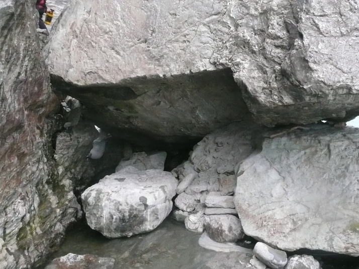 活動内容/井戸瀬(曲り戸の瀬)のメインドロップ右横の大岩の下の空洞に、2006年9月、複数の倒木が入りこんで横たわり、 突き出し、危険なストレーナーとなっていた。倒木の配置と写真